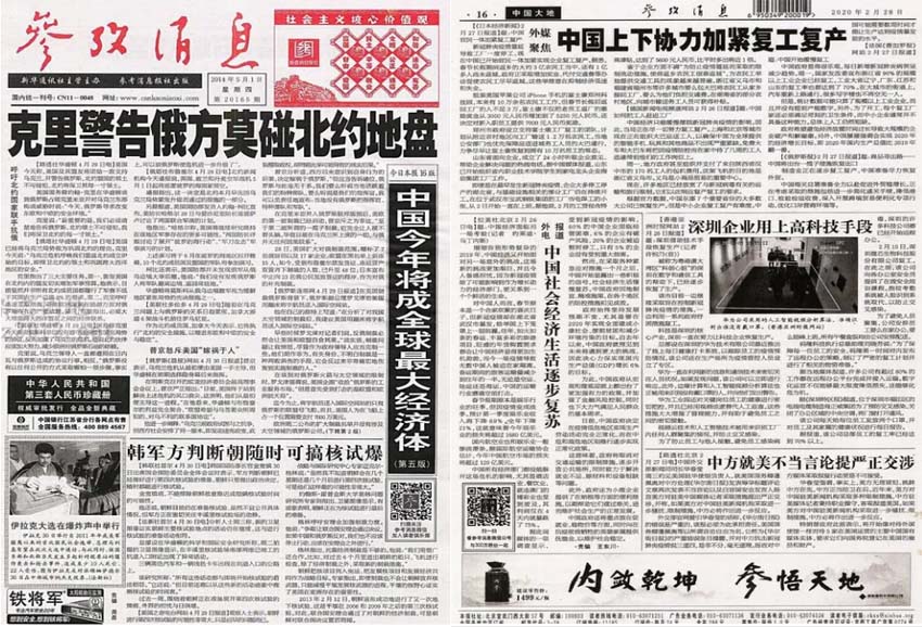 《參考消息》是中國一份權(quán)威性較強(qiáng)、閱讀者覆蓋范圍廣、報道范圍與內(nèi)容廣泛的外交、軍事、經(jīng)濟(jì)、文化、科技新聞類周報,創(chuàng)刊于1958年,是由中國新聞社主辦,時任中共中央總書記鄧小平親自審定命名的。《參考消息》每周六發(fā)行,內(nèi)容主要涵蓋全球重大的政治、經(jīng)濟(jì)等方面的新聞,秉承正面宣傳文化,提倡啟迪思想,面向全球華人及國際讀者發(fā)行。