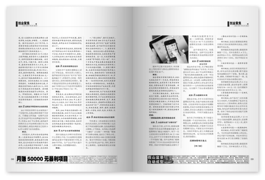 緊密?chē)@中小投資創(chuàng)業(yè)者的需求,提供投資致富的道路和道理,每期都有對(duì)小投資難點(diǎn)熱點(diǎn)問(wèn)題及時(shí)的研究與報(bào)道,并提供大量具投資價(jià)值的商機(jī)信息,是小投資創(chuàng)業(yè)者走向財(cái)富之路的可讀刊物,也是了解和考察中國(guó)小投資創(chuàng)業(yè)現(xiàn)狀和走勢(shì)的可讀刊物,全國(guó)及時(shí)家?guī)椭椭笇?dǎo)中小投資創(chuàng)業(yè)者投資賺錢(qián)的普及性財(cái)經(jīng)雜志。