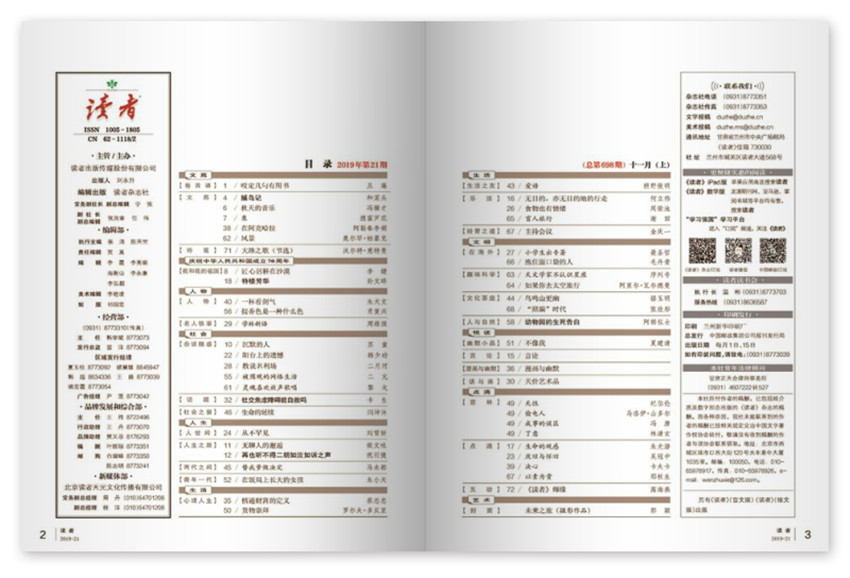 《讀者》創(chuàng)辦于1981年,半月刊,單期84頁(yè),《讀者》是中國(guó)具有廣泛社會(huì)影響力的著名文化綜合類期刊,封面設(shè)計(jì)精美,排版簡(jiǎn)約大方,內(nèi)容傳遞出濃濃的人文關(guān)懷,深受?chē)?guó)人喜愛(ài)。