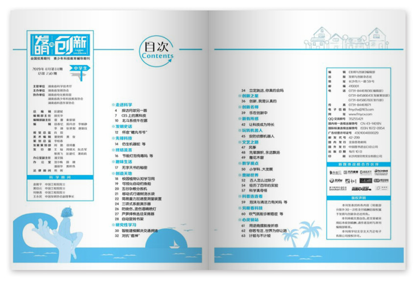《發(fā)明與創(chuàng)新》創(chuàng)辦于1984年,月刊,單期64頁(yè),《發(fā)明與創(chuàng)新》是中國(guó)青少年科學(xué)普及和發(fā)明創(chuàng)新第一刊,將科學(xué)知識(shí)、發(fā)明創(chuàng)新融入學(xué)生的生活與學(xué)習(xí),為讀者提供,前沿的科技資訊。
