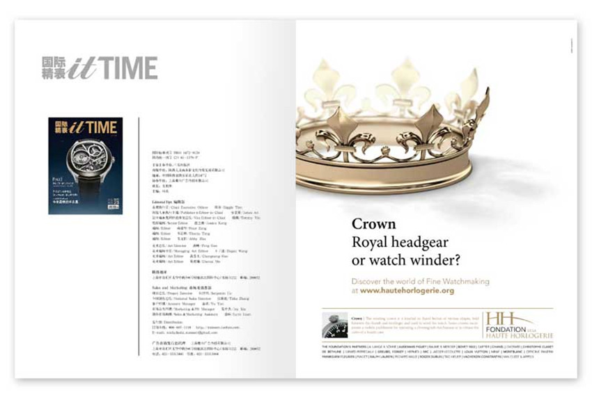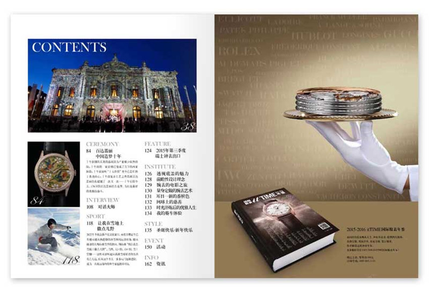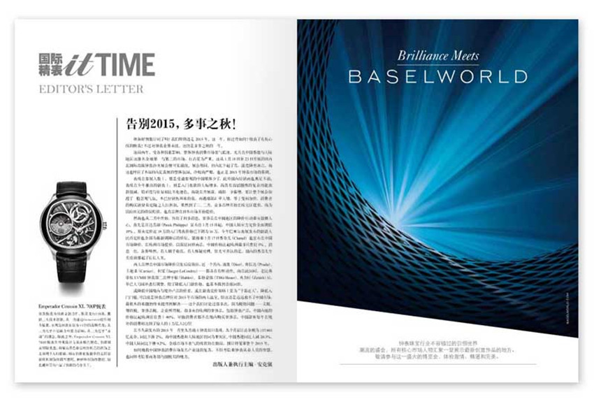 《國際精表itTIME》月刊,單期168頁,《國際精表》的編輯理念遵循“專業(yè)”、 “品味”、“實用”、“視覺”四個原則; 在腕表領(lǐng)域我們體現(xiàn)“專”業(yè),在時尚領(lǐng)域我們體現(xiàn)“?!币?;一切以腕表為核心展開選題。