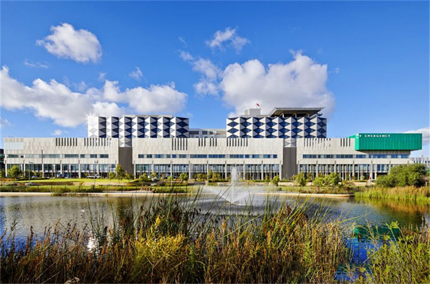初入雍和府,映入眼簾的便是精挑細(xì)選的“巖石”、獨(dú)具匠心的打磨拼接、閃著光卻又暗藏“千山”的金屬飾條,千山流水似瀑布,水面倒影,波光粼粼,如入山水間,此為迎賓。走進(jìn)去,只見設(shè)計(jì)師筆下簡潔有力的線條化作眼前約30米長而無一根立柱的風(fēng)雨連廊,遠(yuǎn)遠(yuǎn)望去,輕薄如云,懸浮在水面之上,不僅規(guī)避了東南角施工塔吊帶來的視覺破壞問題,也創(chuàng)造了靜謐的空間。