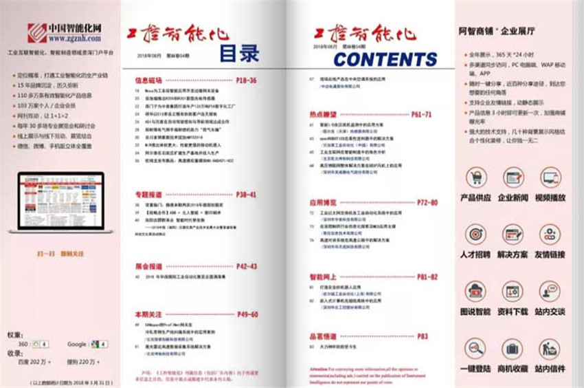 《工控智能化》主要欄目:信息磁場(chǎng)、高管訪談、專題報(bào)道、智能化刊中刊、本期關(guān)注、應(yīng)用博覽、熱點(diǎn)瞭望、智能網(wǎng)上、智能化您上、品名悟道等。