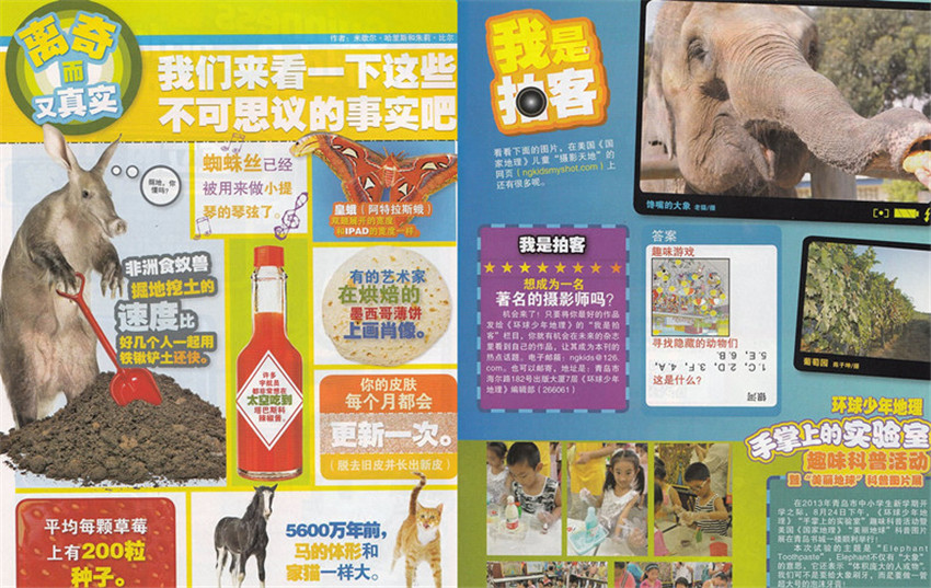 《環(huán)球少年地理》的主要欄目:離奇而又真實(shí)、酷酷的發(fā)明、令人驚訝的動物、勇于探索、我是拍客等。