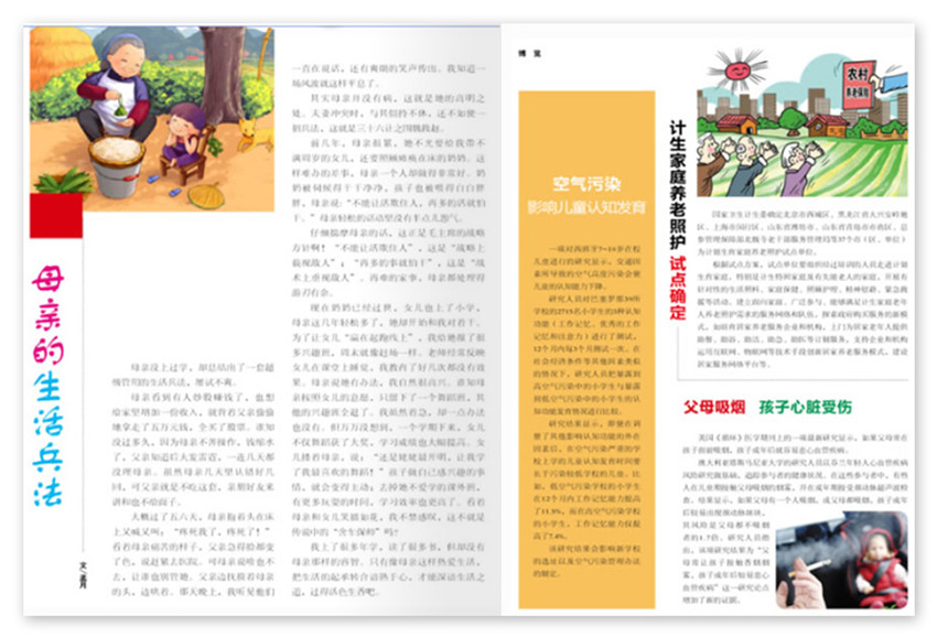 《家庭健康·婚育與優(yōu)生》主要欄目:博覽、特別話題、家庭發(fā)展、孕產(chǎn)課堂、寶貝健康、親子時刻、兩性頻道、吃出健康、安全用藥、計生園地。