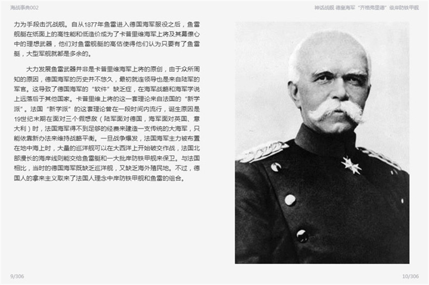 大力發(fā)展魚(yú)雷武器并非是卡普里維海軍上將的原創(chuàng),由于眾所周知的原因,德國(guó)海軍的歷史并不悠久,初就連領(lǐng)導(dǎo)也是來(lái)自陸軍的軍官。這導(dǎo)致了德國(guó)海軍的”軟件”缺乏癥,在海軍戰(zhàn)略和海軍學(xué)說(shuō)上遠(yuǎn)落后于其他國(guó)家??ㄆ绽锞S上將的這一套理論來(lái)自法國(guó)的“新學(xué)派"法國(guó)“新學(xué)派”的這套理論曾在一段時(shí)間內(nèi)流行,誕生原因是19世紀(jì)末期在面對(duì)三個(gè)假想敵(陸軍面對(duì)德國(guó),海軍面對(duì)英國(guó)、意大利)時(shí),法國(guó)海軍得不到足夠的經(jīng)費(fèi)來(lái)建造一支傳統(tǒng)的大海軍,只能依靠新辦法來(lái)維持戰(zhàn)略平衡。一旦戰(zhàn)爭(zhēng)爆發(fā),法國(guó)海軍主力被布置。