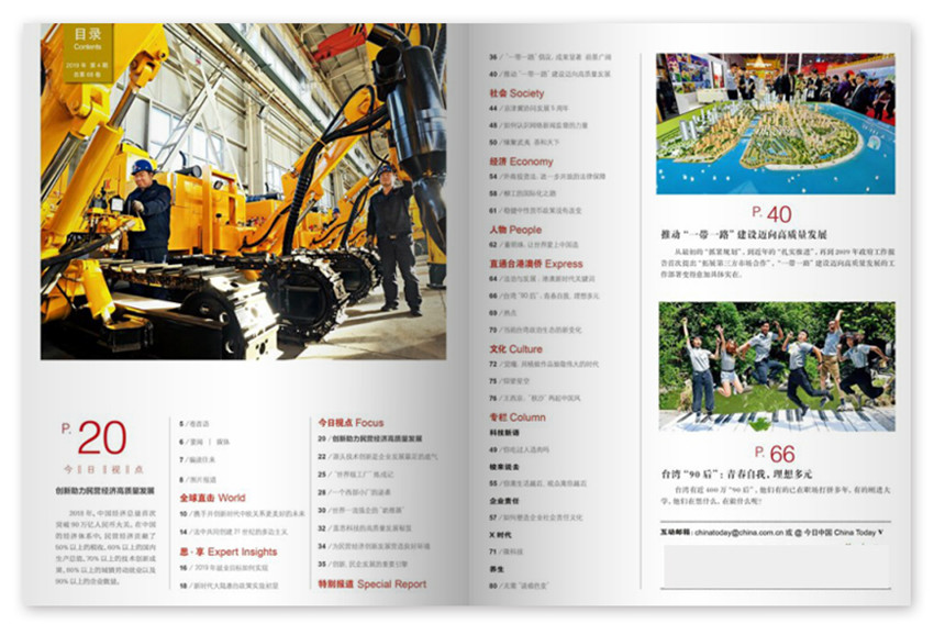 《今日中國(guó)》雜志,(月刊),是面向全國(guó)發(fā)行的外語(yǔ)類(lèi)期刊,雜志擁有獨(dú)到的思維與敏銳的眼光,使得雜志成為眾多國(guó)際大品牌客戶(hù)重視的核心媒體之一。從生活入手,以民間身份、及時(shí)、深度地報(bào)道當(dāng)代中國(guó)的經(jīng)濟(jì)文化社會(huì)現(xiàn)象。它在臺(tái)港澳人士及大陸讀者中享有較高的聲譽(yù),積極溝通兩岸四地之間的信息、增進(jìn)交流、了解與親情,主要讀者對(duì)象為投資、工作、學(xué)習(xí)、生活的臺(tái)港澳人士為主,兼顧世界各地的華人華僑。