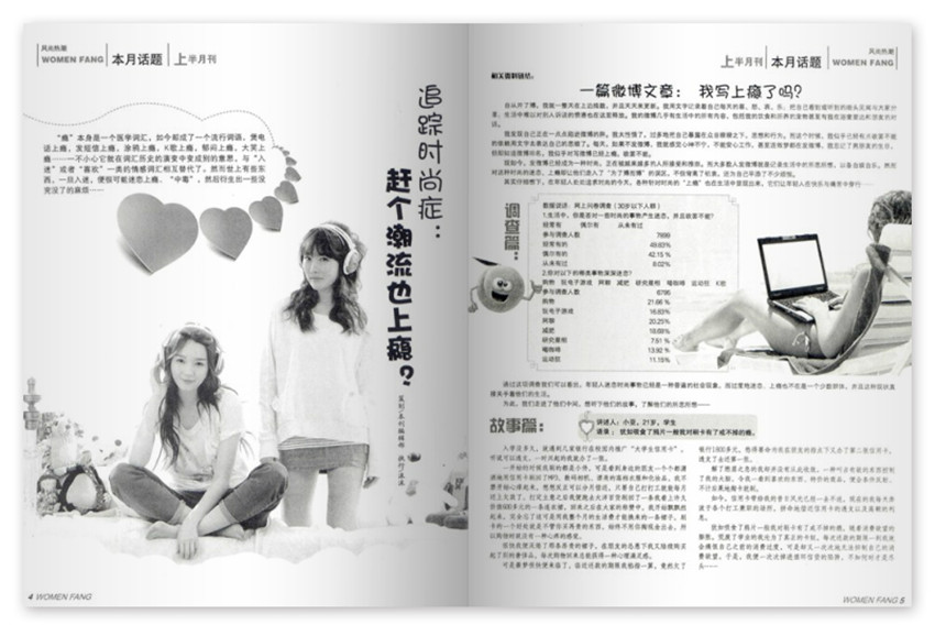 通過處在世紀(jì)之交的現(xiàn)代女性心靈路程的揭示和成長經(jīng)歷的記錄,以及與她們所思所想所憂所喜的溝通和交融,描繪出了當(dāng)今女性真切的生存狀態(tài)、多維的生活方式和追求,以清新活潑的文風(fēng),犀利獨到的目光,精致大方的裝幀,水乳交融的文圖吸引著人們,成為都市知識女性白領(lǐng)麗人的精神享受,成為年輕女孩及大學(xué)生的良師益友。