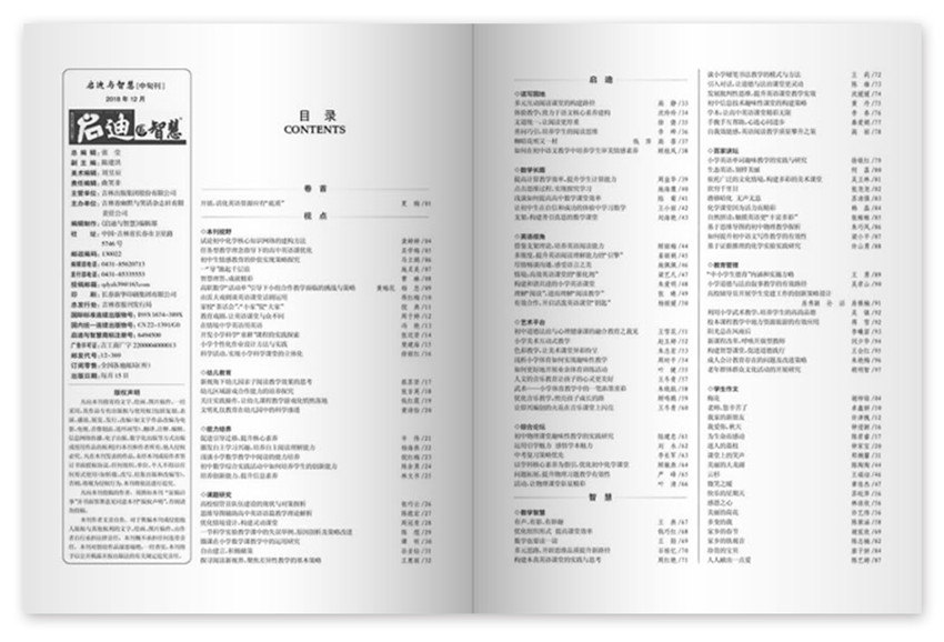 《啟迪與智慧》主要欄目:本刊視野、心理健康、能力培養(yǎng)、課題研究、閱讀與寫作、外語教學、數(shù)理化園地、政史地、教育藝術、教學智慧、學習策略、課堂感悟、管理技巧。