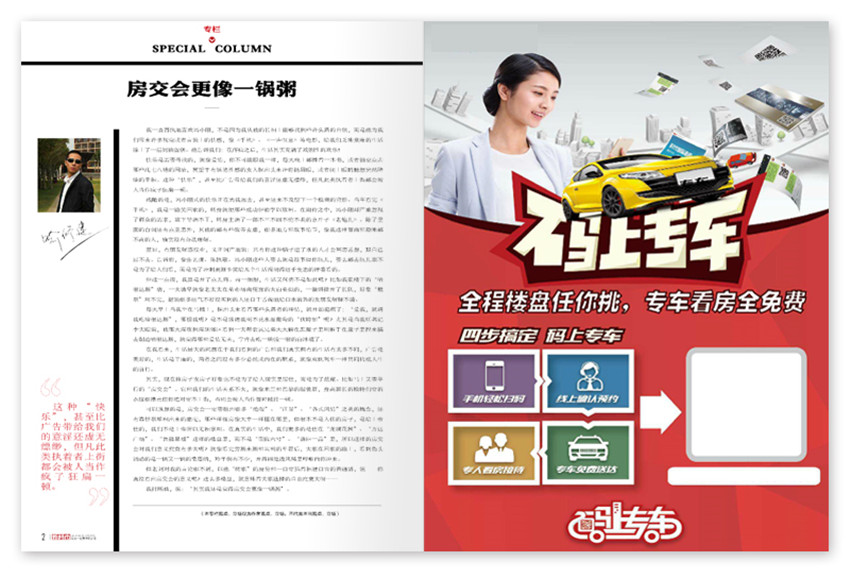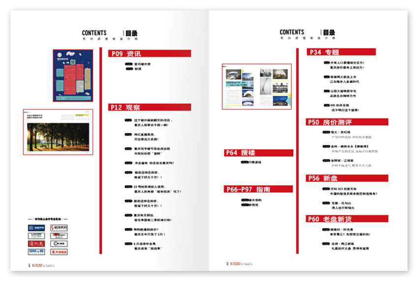 一本新聞性和實(shí)用性資訊并舉的房地產(chǎn)類半月刊,關(guān)注購房人群,內(nèi)容涉及重慶市面上各區(qū)域及樓市熱點(diǎn)。封面是房產(chǎn)開發(fā)商所投放的廣告,封面材料采用亞膜,彰顯大氣質(zhì)感,設(shè)計(jì)上都是專業(yè)記者精心采寫,如為龍湖兩江新宸的稿件,深受購房者及客戶的青睞。