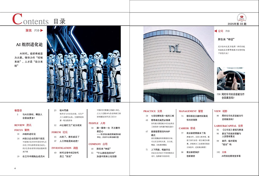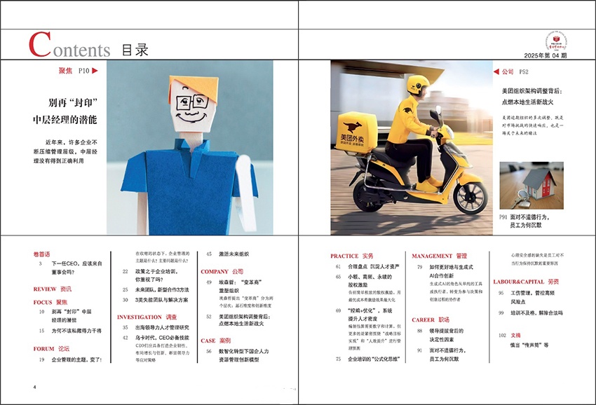 雜志內(nèi)容涵蓋組織行為、人才測評、薪酬體系、績效管理、員工關(guān)系等全模塊,既深入解析勞動政策法規(guī),也持續(xù)追蹤人工智能招聘、靈活用工模式等行業(yè)新趨勢。每期通過案例剖析、專家訪談、調(diào)研報告等形式,為讀者提供系統(tǒng)化知識體系和可落地的解決方案。其特色欄目“企業(yè)人力資源診斷”通過對真實(shí)場景的深度解析,已成為業(yè)內(nèi)廣泛借鑒的實(shí)用工具平臺。