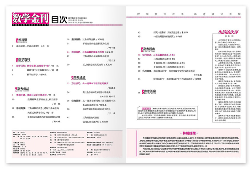 《數(shù)學(xué)金刊》創(chuàng)辦于1979年,月刊,單期64頁,《數(shù)學(xué)教學(xué)通訊·數(shù)學(xué)金刊》雜志近30年堅(jiān)持為中學(xué)數(shù)學(xué)教學(xué)服務(wù)的辦刊宗旨,始終站在數(shù)學(xué)教育研究的前沿。