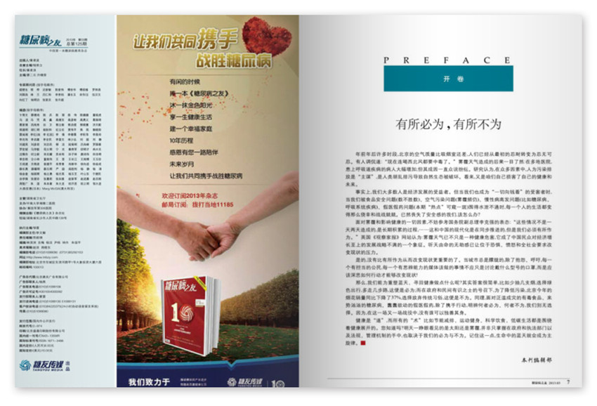 《糖尿病之友》創(chuàng)辦于2001年,月刊,單期80頁,《糖尿病之友》是本在國內(nèi)外公開發(fā)行的糖尿病教育雜志,指導(dǎo)糖友日常生活,刊登讀者經(jīng)驗(yàn)、教訓(xùn),為讀者答疑解惑,增強(qiáng)編讀互動(dòng),具有科學(xué)性。