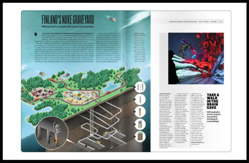 從欄目到設計,雜志力求恢復初的風格。同時,為了保持《連線》獨特的視覺特色,明亮的色彩、濃重的前衛(wèi)氣息依舊是《連線》意圖突出的氣質(zhì),但卻棄用了早年間常用的熒光效果,正文易與廣告混淆的問題得到了解決?;ɑňG綠的MTV風格的拼接版式也被改掉,用色更大膽,但也更專一,同時還顯得更具親和力,而非一派精英氣。