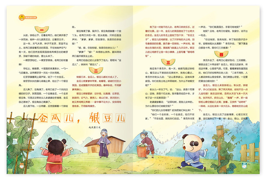 來人啊,把冬瓜、公寓給我收回去!”管家跟班一聲城,抱去了大各盾,搶走了大公雞。金瓜兒、銀豆兒回到家,只見爹爹嘆氣,娘抹淚,一一問原因,才知道是李員外奪走了支山冬瓜、抓山公雞。兄妹倆怒火心頭起:”李員外這只老狼,我們追上前去,和他評一評理!”說罷,金瓜兒提上犁頭,銀豆兒拿起扁擔,兄妹倆出了門,直向大路上追趕。