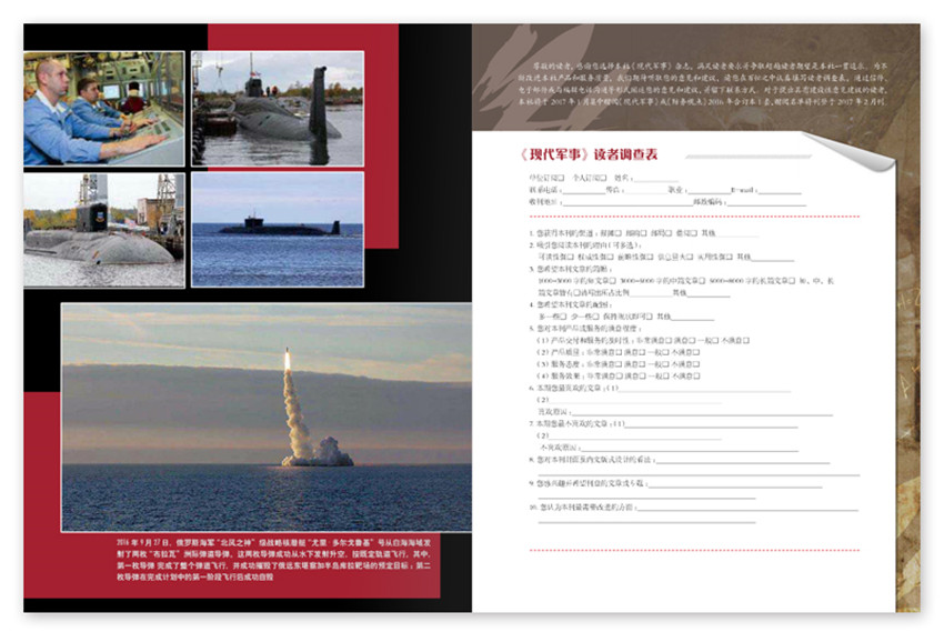 《現(xiàn)代軍事》雜志始終堅(jiān)持以“傳播軍事信息、普及國防教育、交流軍事技術(shù)、促進(jìn)武器裝備建設(shè)、為國防現(xiàn)代化服務(wù)”為辦刊宗旨,以其性、導(dǎo)向性、理論性、前瞻性、可讀性,深受軍事、政治、經(jīng)濟(jì)研究人員、軍工貿(mào)人員、部隊(duì)官兵以及廣大軍事愛好者的喜愛,已成為國內(nèi)外有影響的、我軍武器裝備與軍事技術(shù)領(lǐng)域的性軍事期刊。