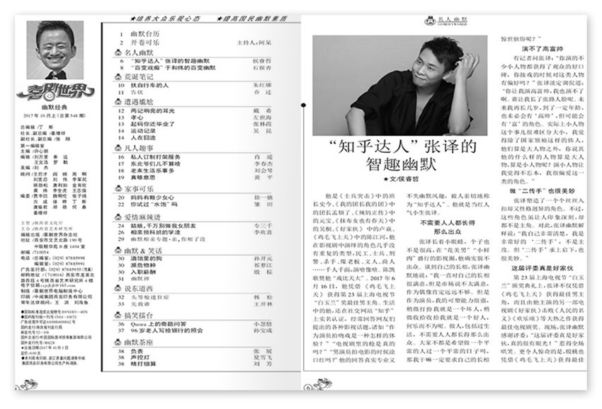 《喜劇世界》創(chuàng)辦于1988年,月刊,單期64頁(yè),《喜劇世界》是中國(guó)創(chuàng)刊較早、發(fā)行量大的幽默生活類期刊,是一本以“生活、勵(lì)志、搞笑、娛樂(lè)、時(shí)尚、品位”為特點(diǎn)的、閱讀性非常強(qiáng)的幽默期刊。