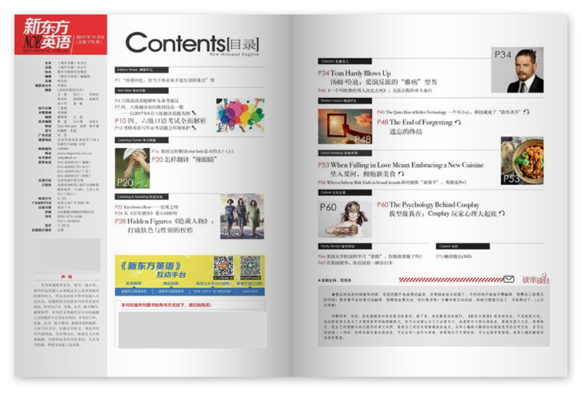 《新東方英語》雜志主要內(nèi)容為實用的考試技巧輔導(dǎo)、的留學資訊、系統(tǒng)的異域文化介紹以及雋永的美文賞析。