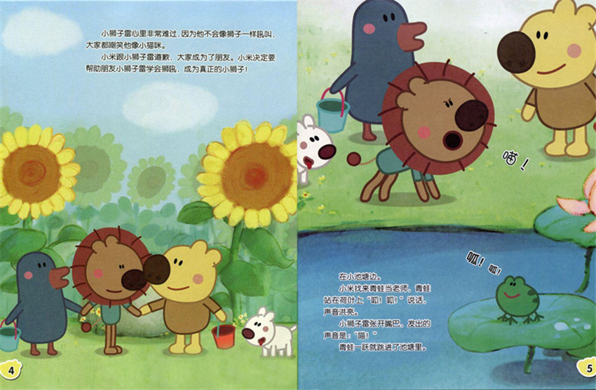 小獅子雷心里非常難過(guò)因?yàn)樗粫?huì)像獅子- -樣吼叫,大家都嘲笑他像小貓咪。小米跟小獅子雷道歉,大家成為了朋友。小米決定要幫助朋友小獅子雷學(xué)會(huì)獅吼,成為真正的小獅子!在小池塘邊,小來(lái)找來(lái)青蛙當(dāng)老師,青蛙站在荷葉上呱呱的說(shuō)話,聲音洪亮。小獅子雷張開嘴巴。發(fā)出的聲音是:喵,青蛙一躍就跳進(jìn)場(chǎng)池塘里。