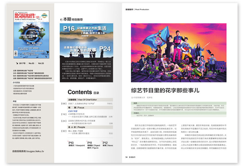 《影視制作》創(chuàng)刊于1994年,期望通過(guò)自身在傳播領(lǐng)域的資源優(yōu)勢(shì),給我們帶來(lái)高品質(zhì)生活,紙張開本:16開,國(guó)內(nèi)刊號(hào):CN:11-5863/TN。全局在胸、相互合作:藝術(shù)制作是電視系統(tǒng)的重要組成部分。作為綜合藝術(shù)的電視,總是由欄目和節(jié)目組成。