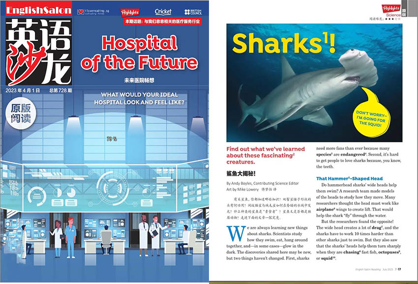 《英語沙龍》主要欄目:HIGHLIGHTS、SOCIAL STUDIES、CRICKET、AMERICAN CAMPUS、BRITISH COUNCIL等。
