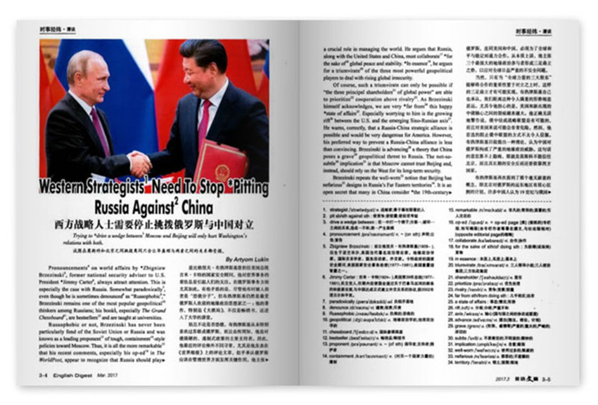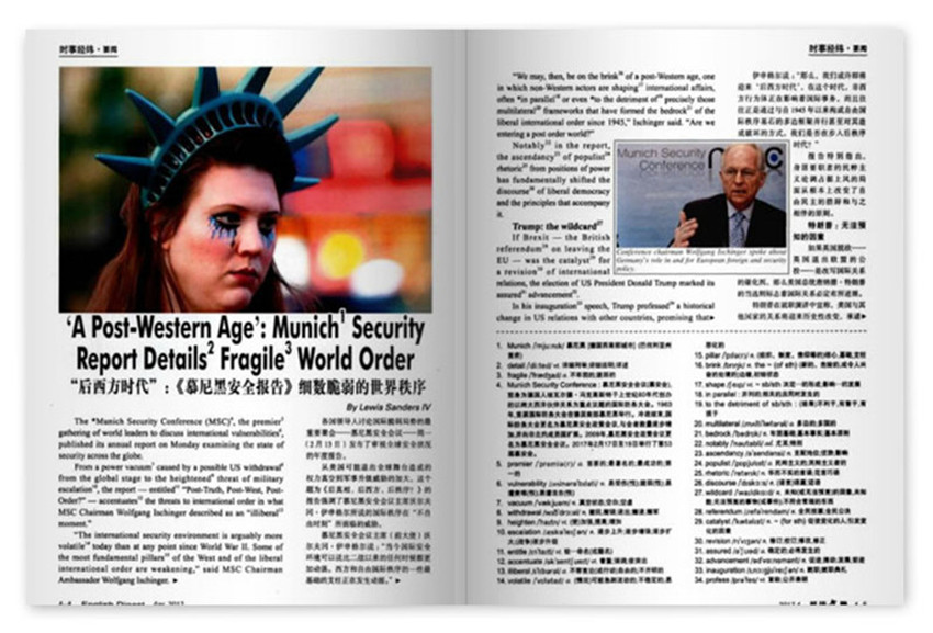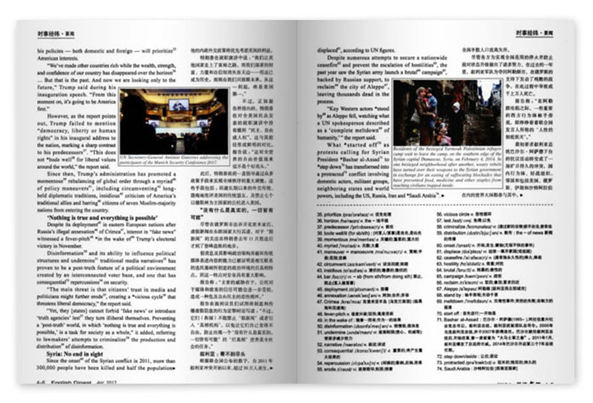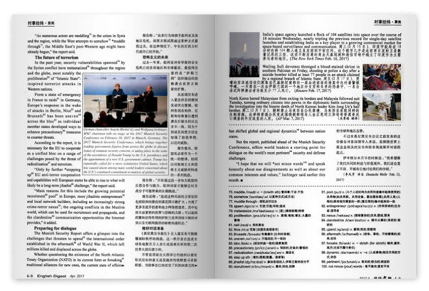 《英語(yǔ)文摘》創(chuàng)辦于1999年,月刊,單期68頁(yè),《英語(yǔ)文摘》雜志集知識(shí)性、實(shí)用性、趣味性于一體,用英漢兩種語(yǔ)言對(duì)照表達(dá),具有增強(qiáng)學(xué)習(xí)興趣、掌握學(xué)習(xí)技巧、提高英語(yǔ)水平和擴(kuò)大知識(shí)視野的多重效應(yīng)。
