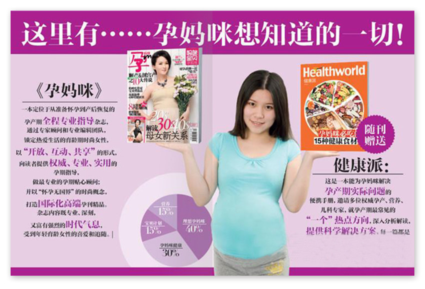 《孕媽咪》雜志鎖定熱愛生活的育齡期時尚女性,以“開放、互動、共享”的形式,向讀者提供、專業(yè)、實用的孕期指導,做最專業(yè)的孕期貼心顧問;并以“懷孕無國界”的時尚概念,打造國際化高端孕刊精品。雜志內(nèi)容既專業(yè)、深刻,又富有強烈的時代氣息,受到年輕育齡女性的喜愛和追隨。