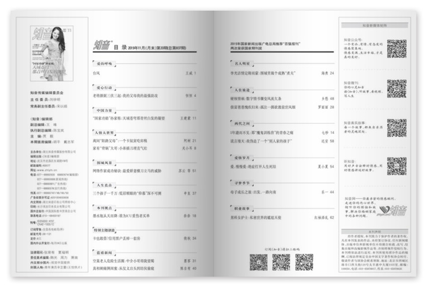 《知音》多層次、多方位、多視角地展示社會生活中真實而廣闊的精彩畫面的《知音》,與廣大讀者心心相印,贏得了讀者的真情和厚愛,成為了受讀者歡迎,讓讀者獲得心靈治愈的閱讀雜志。