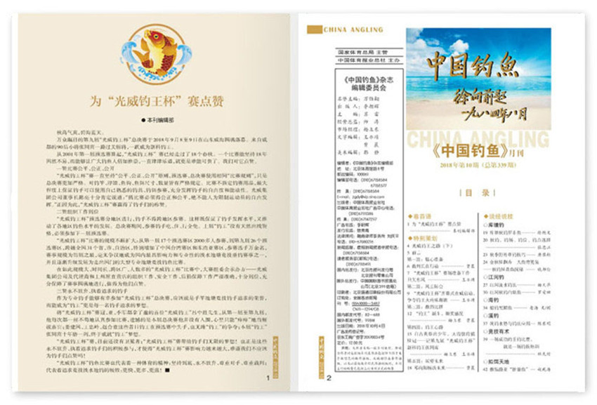 《中國(guó)釣魚(yú)》,創(chuàng)刊于1984年,期望通過(guò)自身在傳播領(lǐng)域的資源優(yōu)勢(shì),給我們帶來(lái)高品質(zhì)生活,紙張開(kāi)本:16開(kāi),國(guó)內(nèi)刊號(hào):CN:11-1294/G8。雜志與國(guó)際、國(guó)內(nèi)釣魚(yú)界交往廣泛,具有一定的國(guó)際、國(guó)內(nèi)影響。