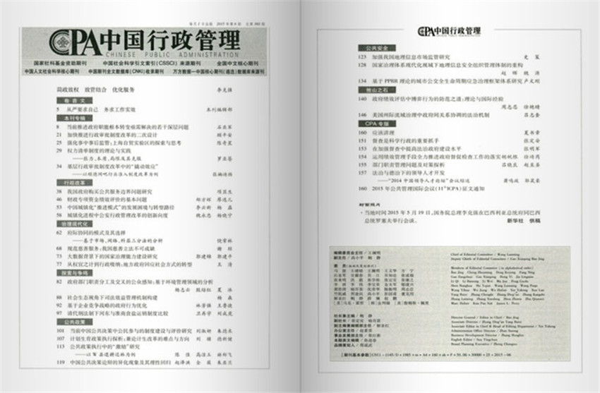 《中國(guó)行政管理》雜志是由國(guó)務(wù)院辦公廳主管,中國(guó)行政管理學(xué)會(huì)主辦,是新中國(guó)成立后創(chuàng)辦的第一本研究行政管理的專業(yè)刊物,是反映政府行政管理理論與實(shí)踐的北大圖書館收錄期刊,也是目前我國(guó)行政(公共)管理學(xué)科大型綜合性期刊,被北大圖書館收錄期刊要目總覽列為“政治學(xué)類”第一位、“管理學(xué)類”第一位。2012年入選國(guó)家社科基金學(xué)術(shù)期刊首批資助名單(批準(zhǔn)號(hào)12QKA095)。