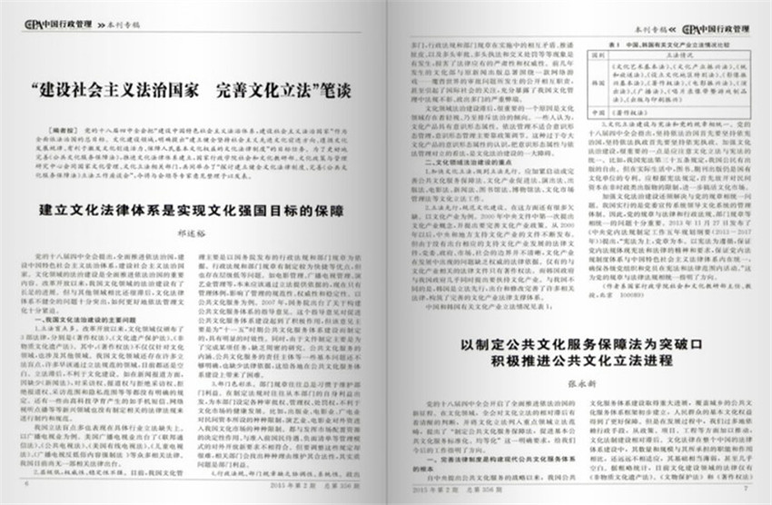 建設(shè)社會(huì)主義法治國(guó)家、完善文化立法”筆談,黨的十八屆四中全會(huì)把“建設(shè)中國(guó)特色社會(huì)主義法治體系,建設(shè)社會(huì)主義法治國(guó)家”作為依法治國(guó)的總目標(biāo)。文化建設(shè)領(lǐng)域,明確提出“建立健全堅(jiān)持社會(huì)主義先進(jìn)文化前進(jìn)方向、遵循文化發(fā)展規(guī)律、有利于激發(fā)文化創(chuàng)造活力、保障人民基本文化權(quán)益的文化法律制度”的目標(biāo)任務(wù)。為了更好地完善《公共文化服務(wù)保障法》,推進(jìn)文化法律體系建立,國(guó)家行政學(xué)院社會(huì)和文化教研部、文化政策與管理研究中心會(huì)同國(guó)家文化管理、文化立法相關(guān)部門,共同舉辦了“探討建立健全文化法律制度。