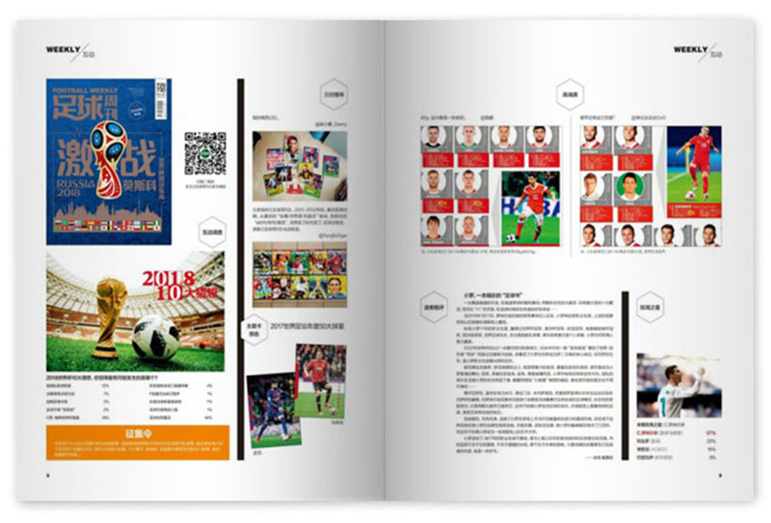 《足球周刊》,創(chuàng)刊于2001年,期望通過自身在傳播領域的資源優(yōu)勢,給我們帶來高品質生活,紙張開本:16開,國內(nèi)刊號:CN:43-1353/G8。超級巨星的傳奇人生,一場比賽背后的風起云涌這本雜志將是你的球場“佳音”,我們可以通過封面人物得知這一期雜志會有大篇幅關于這位球星的專訪文章;而且,雜志中會寫一些關于近期熱門賽事的詳評,大量的高清圖片,只為給讀者展示真實的賽事盛況,實用性十分高。