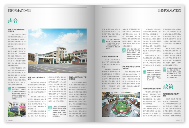 以性、受眾廣、影響大為特點(diǎn),報(bào)道“公寓、別墅、商鋪”等多種物業(yè)資訊,解決“找房、選房、買房、租房”等各類實(shí)際問題,目前已成為上海地區(qū)發(fā)行量大、影響廣泛的房地產(chǎn)雜志。主要欄目:熱盤探營、熱盤鑒賞、熱盤推介、區(qū)域詳解等等。