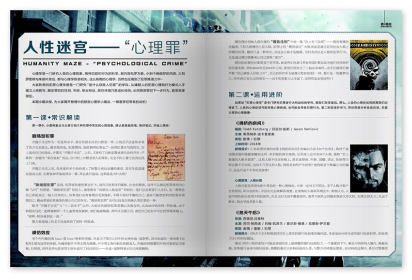 人性迷宮,心理學是一門研究人類的心理現(xiàn)象、精神功能和行為的科學,其內(nèi)容包羅萬象,小到今晚做夢的內(nèi)容,大到羅密歐與朱麗葉效應,都與心理學息息相關。這么有用的心理學,當然也應用到了犯罪推理之中,大家熟悉的犯罪心理學便是一門研究“是什么導致人犯罪”的學科,從嫌疑人的犯罪心理和行為模式入手建立人物側寫,圈定罪犯的性別、年齡、職業(yè)特征、居住環(huán)境乃至成長經(jīng)歷,從而預測罪犯下一步行為,直至緝拿罪犯。
