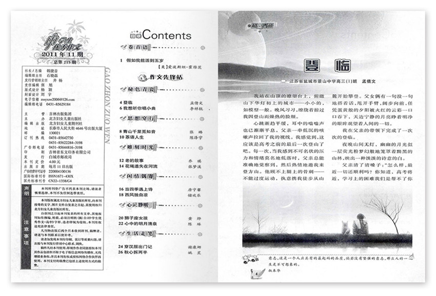 提倡“說(shuō)真話,做真人”為辦刊宗旨,故深受中學(xué)師生歡迎,主要欄目:金素材、時(shí)文素材、名校作文、作文講堂、在路上、作文素材實(shí)戰(zhàn)點(diǎn)擊、滿分作文讀解、新格言等。