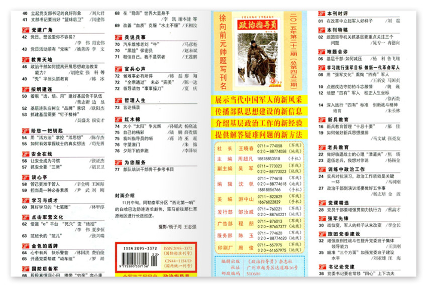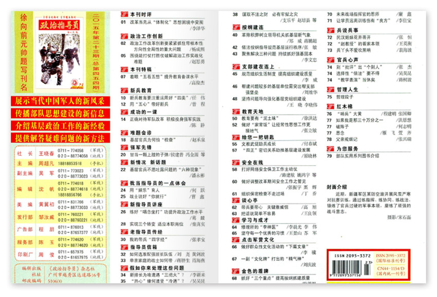 《政治指導(dǎo)員》創(chuàng)辦于1982年,半月刊,《政治指導(dǎo)員》被中國(guó)人民解放軍總政治部列為全軍和武警部隊(duì)連以上單位必訂期刊,欄目特色鮮明,形式喜聞樂(lè)見(jiàn),文章短、新、活、實(shí),語(yǔ)言通俗樸實(shí),編排圖文并茂。